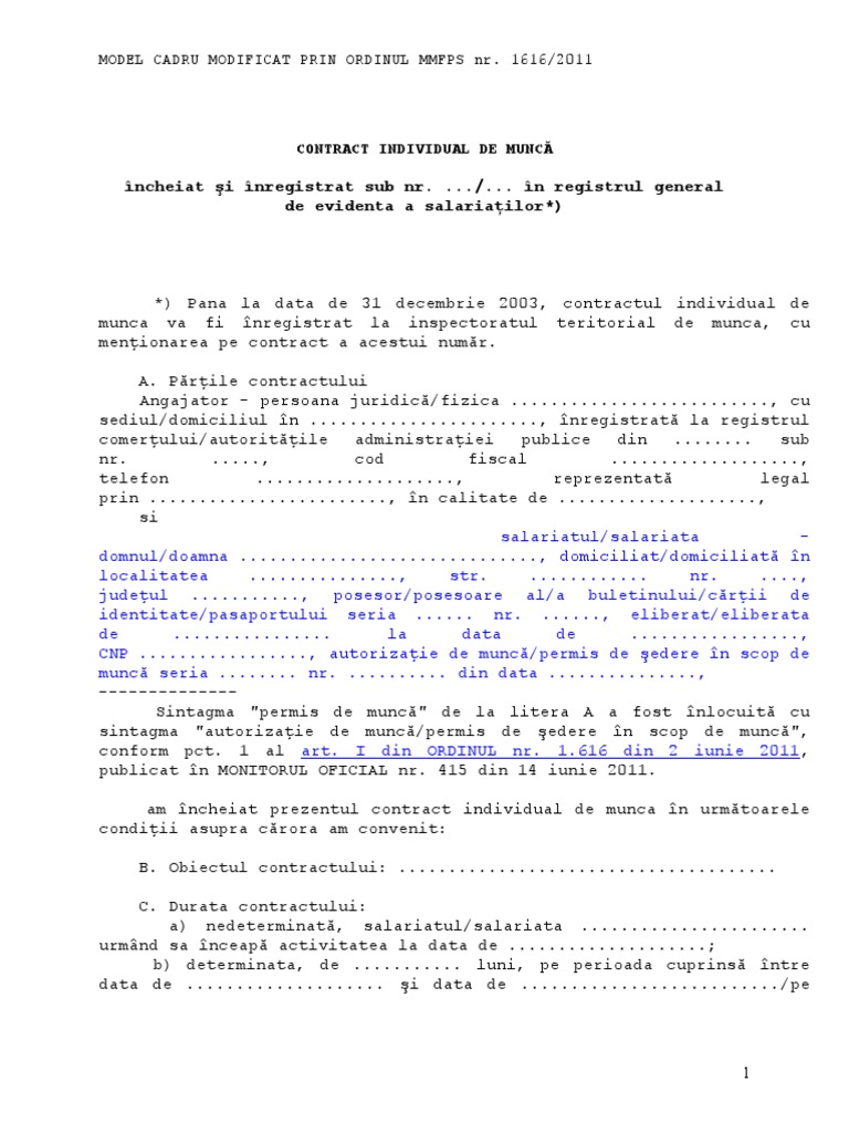 Locul de muncă al salariatului poate fi schimbat temporar de către angajator prin deplasarea în. Tot ce trebuie sa ai in vedere ca sa te ajute cand inchei, modifici, termini un contract de munca. Fiecare din părţi încheie contractul datorită contractul individual de muncă se bazează pe raportul de autoritate (subordonare) în care se află stabilirea obiectului contractului individual de muncă.