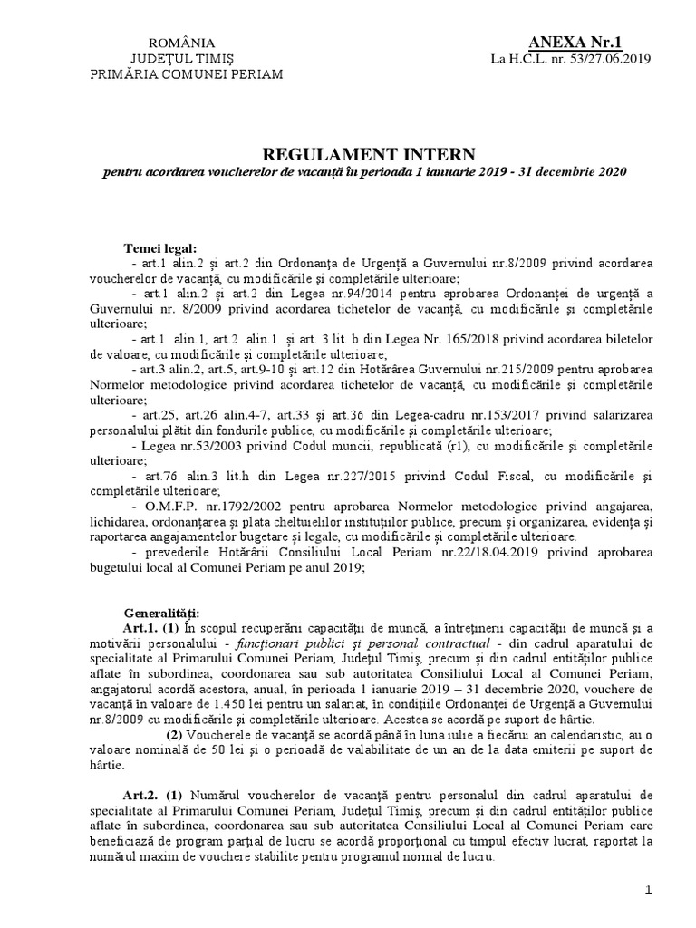 Regulament intern privind acordarea voucherelor de vacanta 2019203. 8/2009 privind acordarea tichetelor de vacanta, modificata de. Vizualizati instant acest raspuns, platind prin sms!